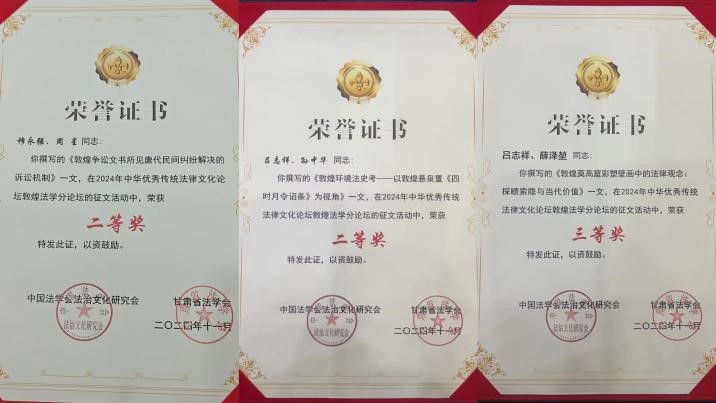 吕志祥、孙中华的论文《敦煌环境法史考——以<四时月令诏条>为视角》及穆永强、周星的论文《敦煌争讼文书所见唐代民间纠纷解决的诉讼机制》获论坛优秀论文二等奖。吕志祥、薛泽堃的论文《敦煌莫高窟彩塑壁画中的法律观念:探赜索隐与当代价值》获论坛优秀论文三等奖。经会员大会同意,孙中华同学被吸纳为甘肃省法学会敦煌法学研究会会员。